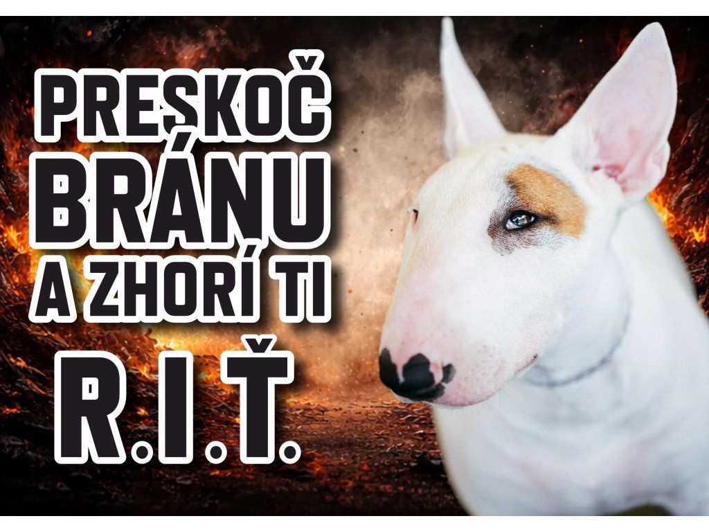 Výstražná plastová tabuľka „Preskoč bránu a zhorí ti R.I.T.“ s motívom psa bulteriér je originálnym a výrazným spôsobom, ako označiť pozemok so strážnym psom.