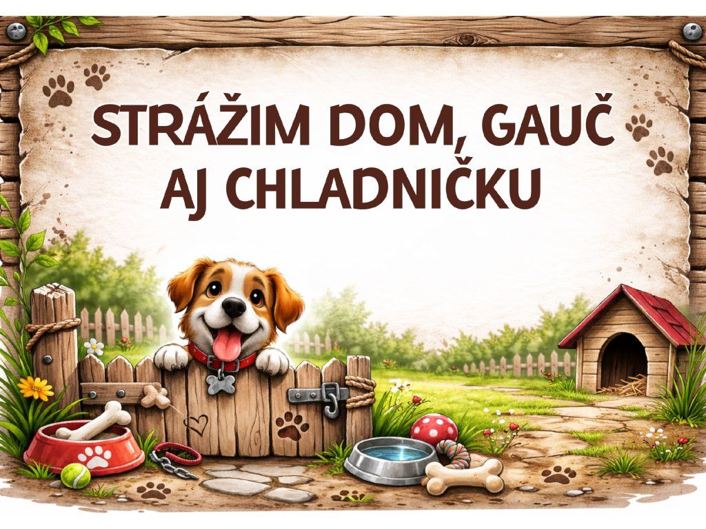 Humorný text naznačuje, že pes síce stráži, ale najmä to najdôležitejšie – dom, pohodlie a samozrejme chladničku. Tabuľka tak plní preventívnu funkciu a zároveň vytvorí úsmev na tvári každému návštevníkovi.